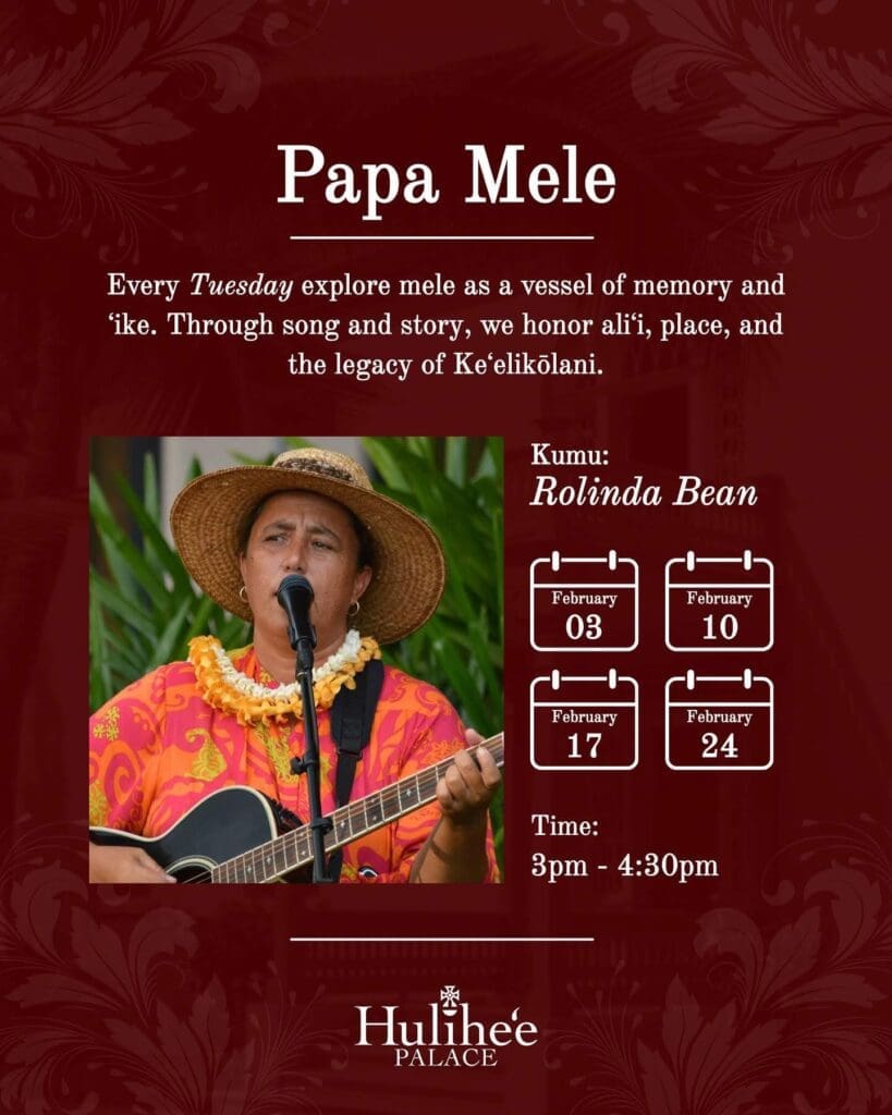 Papa Mele – Every Tuesday Papa Mele Tuesdays 3pm to 4:30pm Join the celebration! Every Tuesday explore mele as a vessel of memory and ʻike. Through song and story, we honor aliʻi, place, and the legacy of Keʻelikōlani on the grounds of Huliheʻe Palace. Kumu: Rolinda Bean Tuesdays, February 3, 10, 17, 24 3 pm to 4:30 pm Click here to register Tags: community festival, hulihee, Mele Date Feb 03 2026 Expired! Time 3:00 PM - 4:30 PM Location Hulihe‘e Palace 75-5718 Ali‘i Dr., Kailua-Kona, HI 96740 Organizer Daughters of Hawaiʻi Phone 808-595-6291 Email info@daughtersofhawaii.org