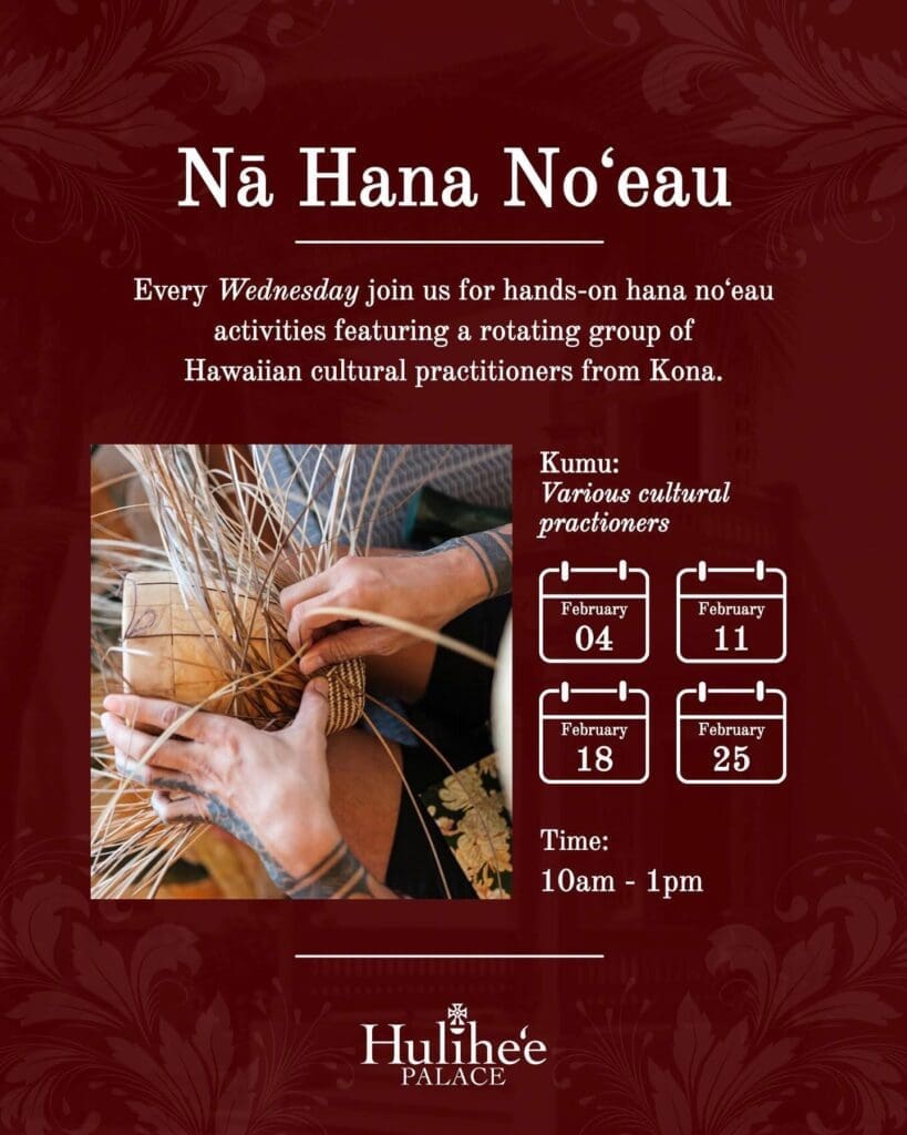 Every Wednesday join us for hands-on hana noʻeau activities on the palace grounds featuring a rotating group of Hawaiian cultural practitioners from Kona.