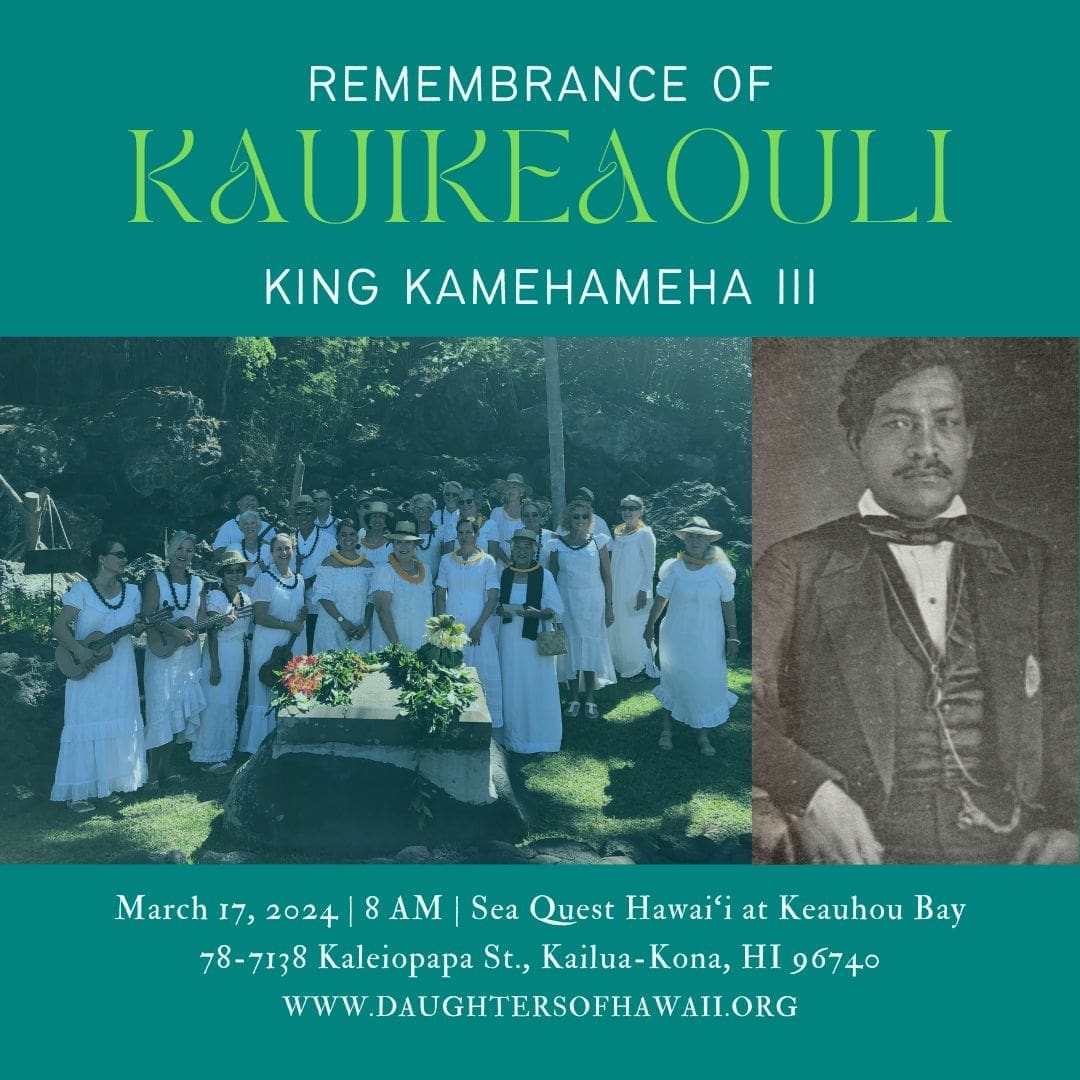 Remembrance of Kauikeaouli Date Mar 17 2024 Expired! Time 8:00 AM - 10:00 AM Location Sea Quest Hawai‘i 78-7138 Kaleiopapa St, Kailua-Kona, HI 96740 Website https://www.seaquesthawaii.com/